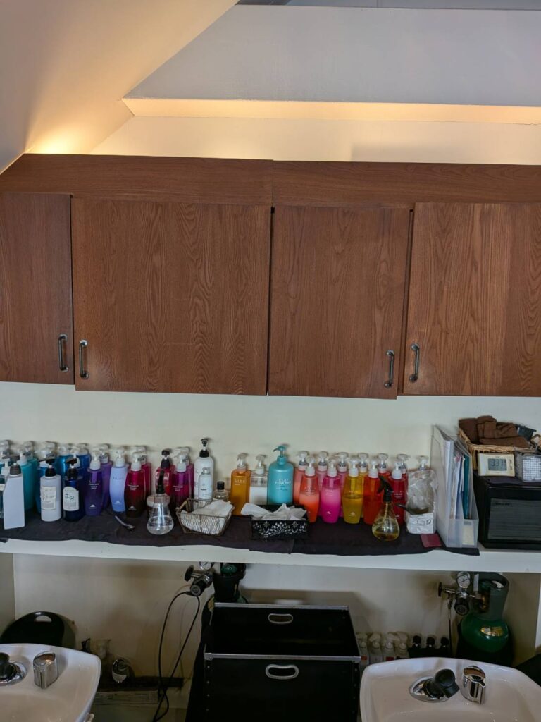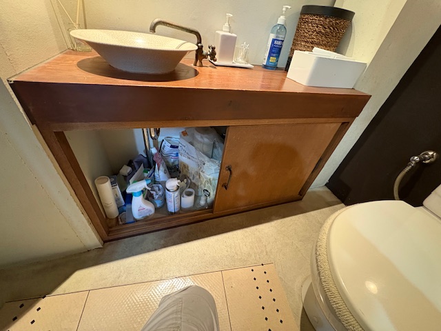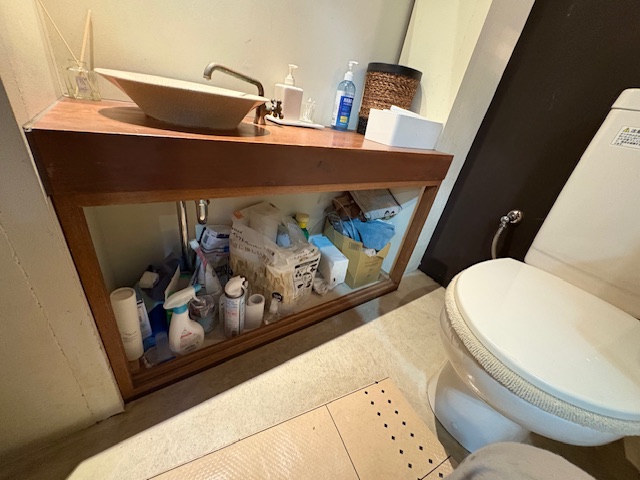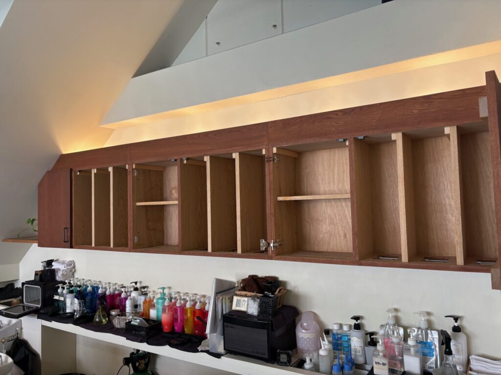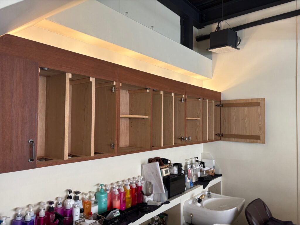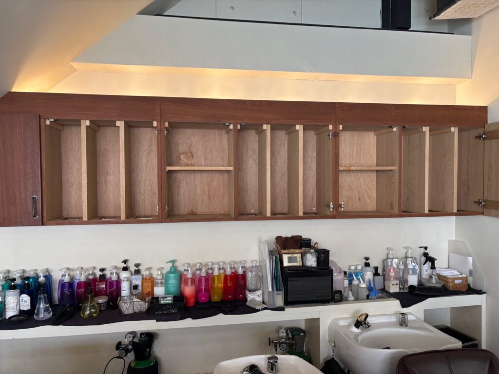 いつもお世話になっております先輩N様のご紹介で阿倍野区の美容室H様のシャンプー台の棚板修繕とトイレ収納庫修繕工事を行う運びとなりました。