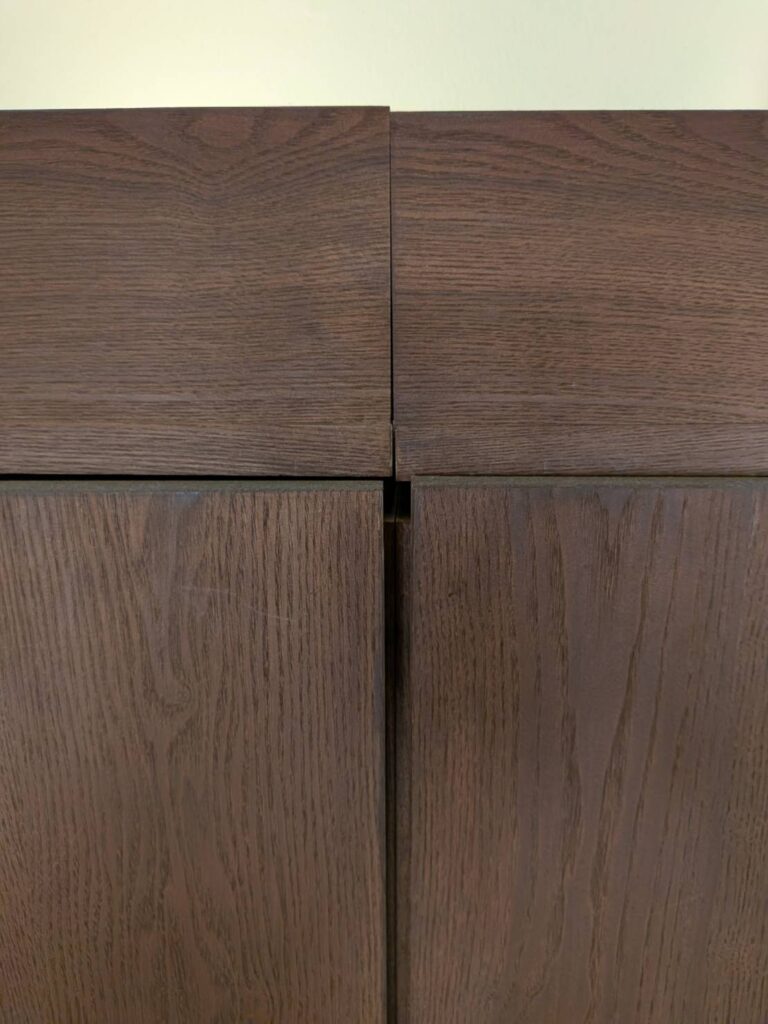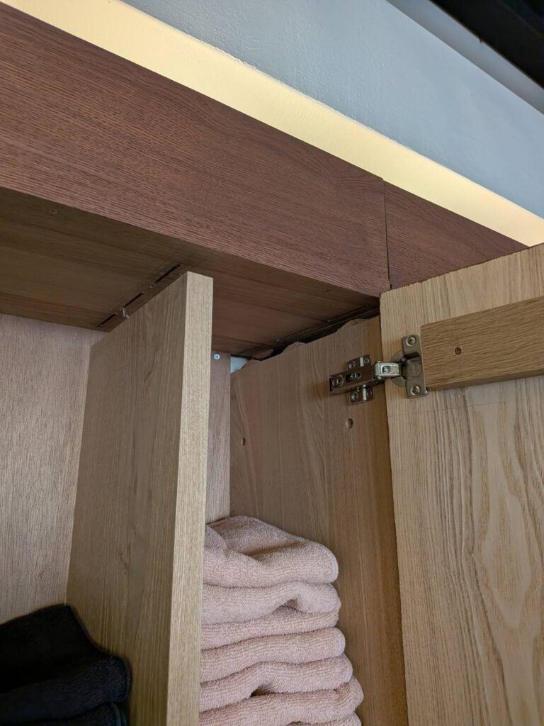 棚の天板と仕切り板が木工ボンドとジョイント板での固定でした。経年と重みでだんだんと全体に落ちてきていましたのでボンドを注入し床から ジャッキアップ、天井からもジャッキダウンし目立ちにくいビスで各棚板を固定していきました。背面の板もベニヤ板でしたのでビスで固定しました。各扉も調整し良い感じで仕上がりました。